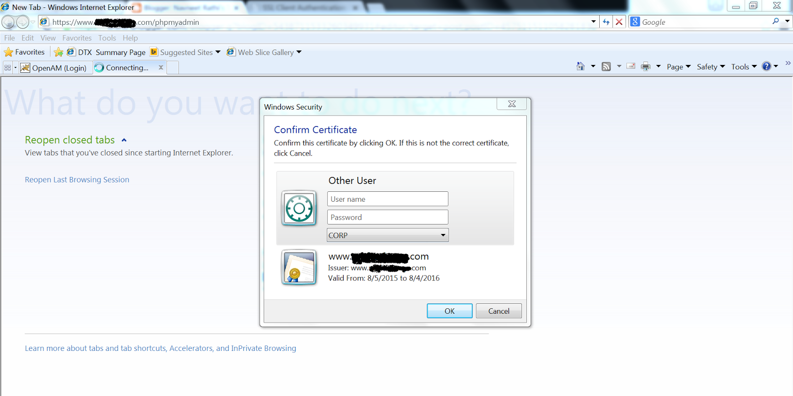 Looks like a pretty similar process to generating a server certificate, huh?Lastly, import the .p12 file into your browser. On Windows you can double click the file to import into the operating system’s keystore that will be used by IE and Chrome. For Firefox, open the Options -> Advanced -> Certificates -> View Certificates -> Your Certificates and import the certificate.Now, visit your website with the browser where you imported the client certificate. You’ll likely be prompted for which client certificate to use – select it. Then you’ll be authenticated and allowed in! - Generate a private key for the SSL client.